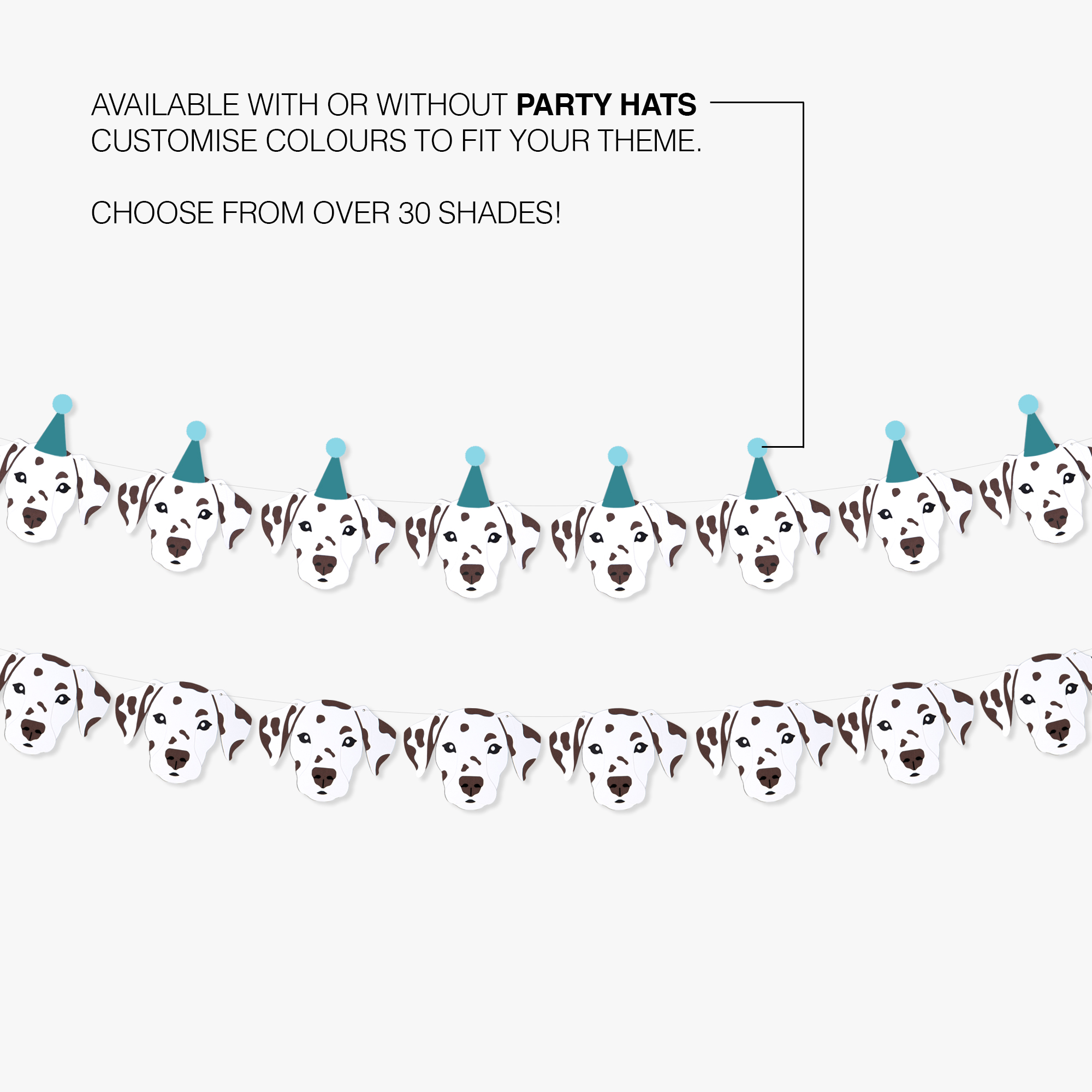 Our Liver Spotted Dalmatian Garland is ideal for anyone who wants to celebrate their love of dogs with a personalised, high-quality decoration. Each garland is carefully handcrafted, showcasing 8 adorable Dalmatian faces with optional colourful party hats, making it perfect for puppy parties, children’s birthday celebrations or as a cute and thoughtful gift for any dog lover.