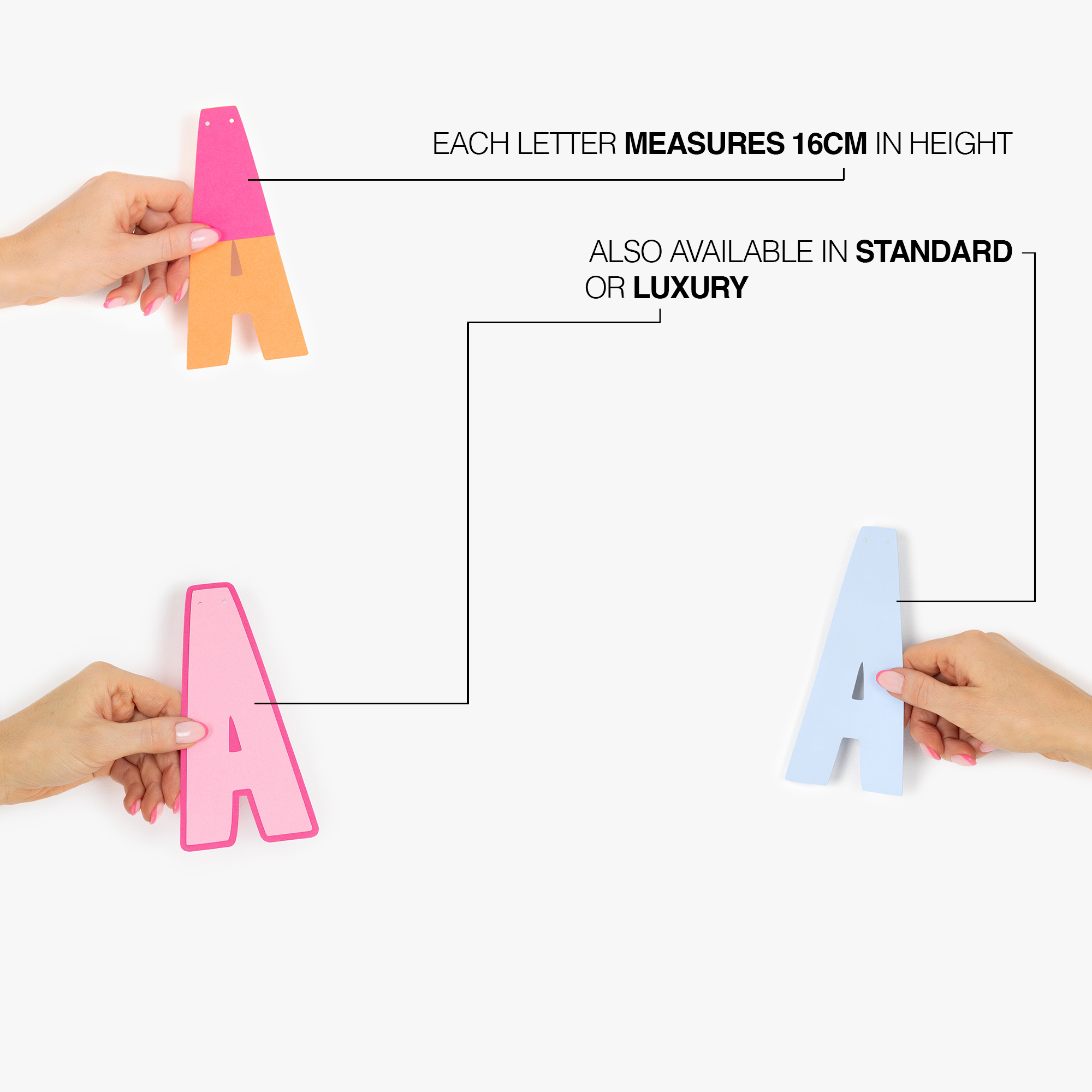 With over 30 colours to choose from, you can customise both shades to perfectly suit your event theme. Made from high-quality card stock, each letter measures 16cm tall and is pre-strung with clear string for an easy, seamless display on any wall, backdrop or space.