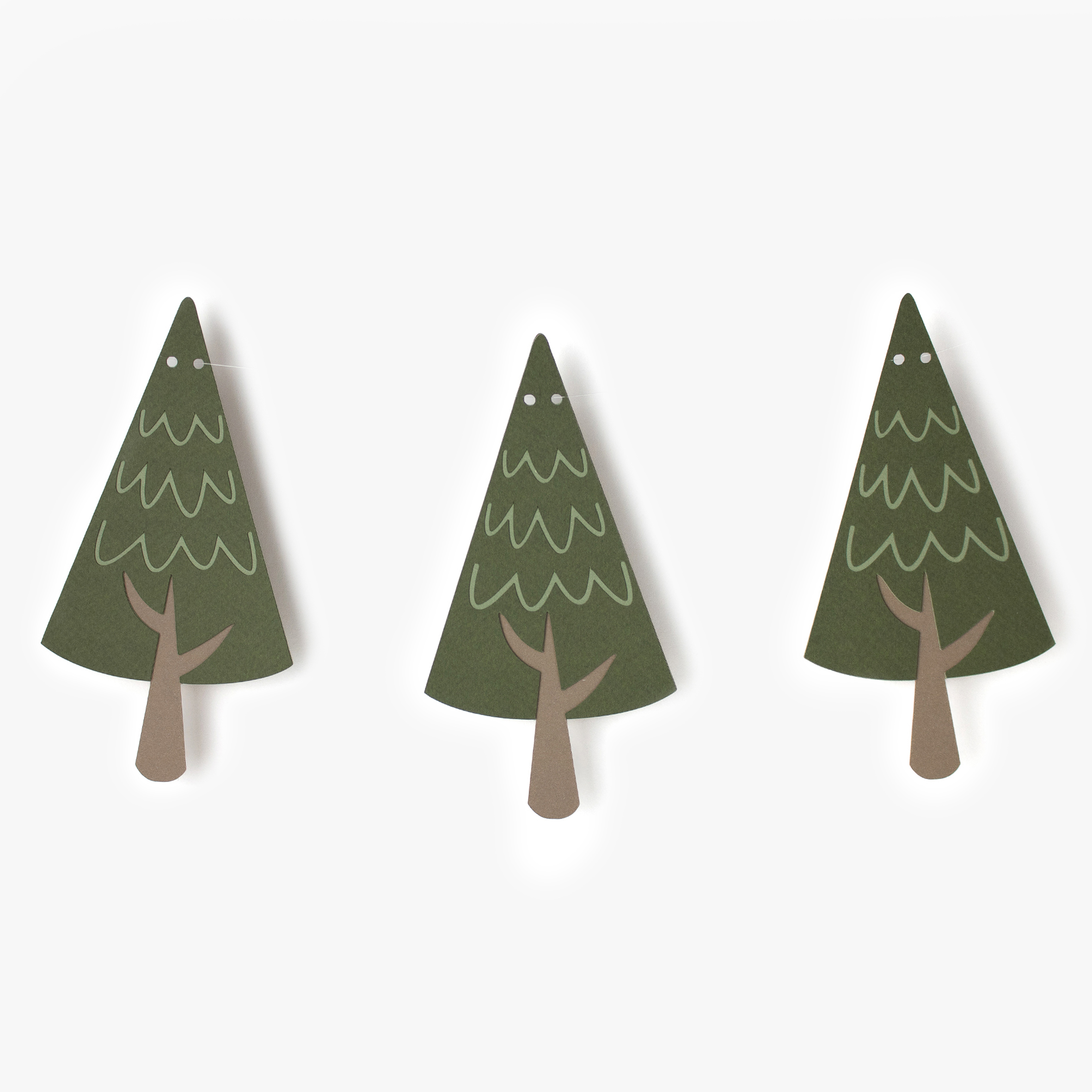 Each tree is carefully handcrafted from premium-quality cardstock and pre-strung on a clear, nearly invisible thread for a subtle floating effect on walls, backdrops or shelves. Measuring approximately 150cm in length, with each tree around 16cm tall, the spacing can be easily adjusted to suit your space and styling.